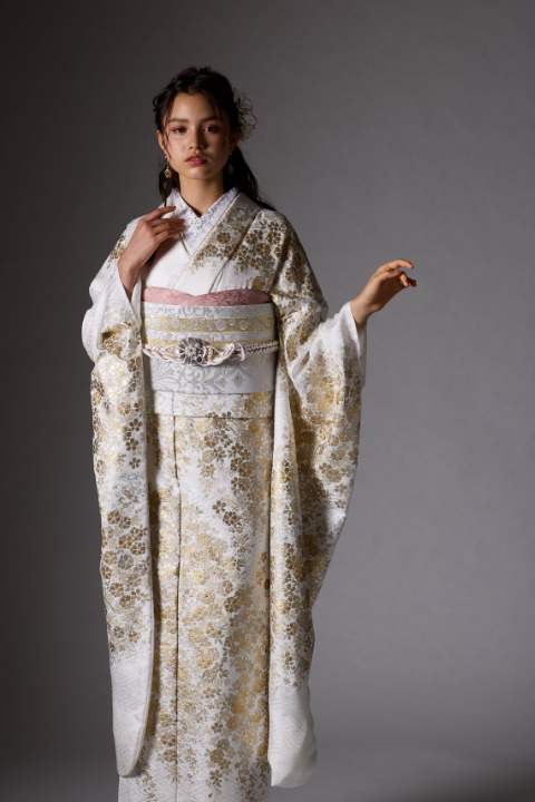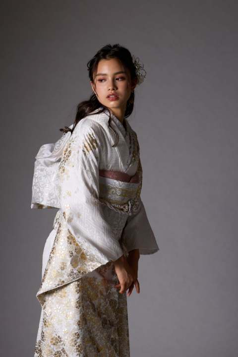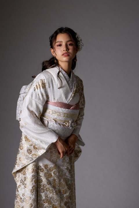 純白の振袖に金銀箔が輝き、シンプルながらも上品で特別感溢れる振袖。
